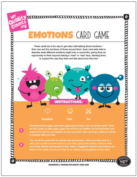 These cards are a fun way to get older kids talking about emotions – their own and the emotions of those around them. Each card asks kids to describe what different emotions might look or sound like, giving them an opportunity to think beyond making a “mad” or “sad” face, allowing them to expand the way they think and talk about how they feel. Download the Printable
