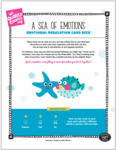 These cards can be used as a fun, any-day activity. But as your kids learn the actions on each card, their experience with this deck can turn into an easy way to call attention to and regulate emotions. For instance, if you see your kids becoming frustrated, you might say, “I know you’re frustrated. Let’s stop for a minute and do the Whale Wail.” Or, if they’re feeling antsy after a long drive, “Let’s stretch like a starfish and then do the Jellyfish Sway.” Use this FREE printable to help your child practice regulating their emotions! Download the FREE Card Deck