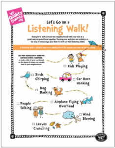 Going for a walk around the neighborhood with your kids is a great way to spend time together. Turning your walk into an activity is a fun way to encourage your kids to work on their listening skills! Download the Activity Sheet