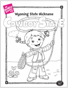 Use this coloring page as you and your little one continue to learn about the state of Wyoming! Did you know? A cowboy on a bucking horse is Wyoming’s official registered trademark, which has led to many calling Wyoming the Cowboy State. For more fun, try having your own rodeo at home using stuffed animals! Download the Activity Sheet