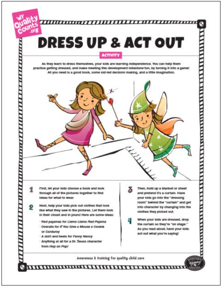 Learning to take the initiative leads to independence and is an important part of development. An easy thing your kids can do to learn independence is get dressed by themselves! You can help them master getting dressed on their own by making it a game. All you need is a good book, some kid-led decision-making, and a little imagination. Download the Activity Sheet