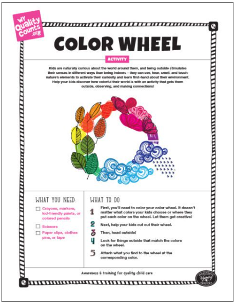 Fresh air and free play improve sensory skills, positively affect physical health and promote cognitive development. Let your kids get creative in the ways they play by encouraging them to use their imaginations while they explore outdoors. This color wheel activity will get them observing and making connections! Download the Activity Sheet