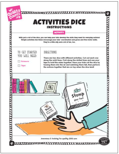 Gross motor skills are involved in coordinated movements by large muscle groups, like the arms and legs. Fine motor skills are involved in smaller movements, like in the hands and fingers, feet and toes. Engaging your kids in simple activities, like the ones on these DIY Activity Dice, will help them develop the skills they need for everyday actions! Download the Activity Sheet