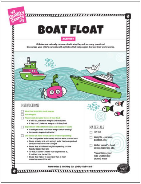 Children are naturally curious – that’s why they ask so many questions! Encourage their curiosity with engaging activities like this one: create your own boats, add weights to them and see if they sink or float! This activity will help you explain the science of why things float (or don’t)! Download the Activity Sheet