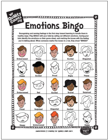 When you ask about and acknowledge your kids’ feelings, you’re sending the message that feelings are valued and important. Use this activity to help your little one learn to identify important emotions. Download the Activity Sheet. Watch this video to find out how to use our emotions bingo activity sheets.
