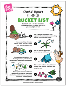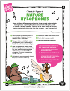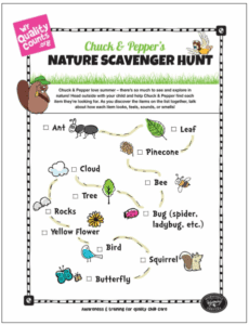 Join Chuck & Pepper as they explore the outdoors – there’s so much to see and explore in nature together! As you discover items on the list, talk about how each item looks, feels, sounds, or smells! Is your little one extra curious? What else could you add to the list to make your own nature scavenger hunt? Download the Activity Sheet