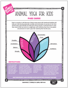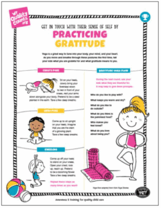 As you move and breathe through these postures with your kids, talk about what you are grateful for. Ask your kids what they are grateful for, too! You may need to give them some prompts, but listen to what they say – you might be surprised, and it may just fill your heart. Download the Activity Sheet