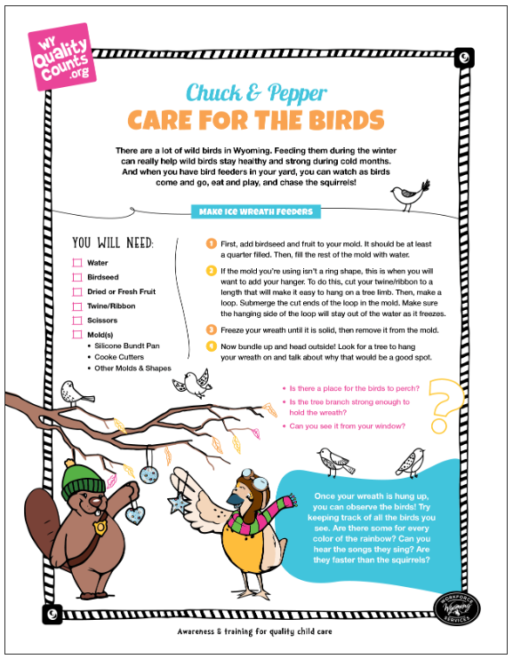 Connect with your kids while connecting with nature! Making ice wreath bird feeders together is a great way to care for the wild birds in your neighborhood, and to keep your kids engaged in the outside world – even when it’s cold. Download the Activity Sheet