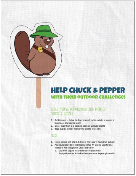 First, download and print out your FREE copy of Chuck and Pepper! Cut them out — follow the lines or don’t, cut in a circle, a square, a triangle, or any way you want! Glue or tape them to a popsicle stick (or a regular stick!). Head outside to your backyard or favorite local park. Next, take a picture with Chuck & Pepper while you’re having fun outside! Post your picture on social media and tag WY Quality Counts for a chance to win an Explorers Club Field Guide! (You can find us on Facebook and Instagram!). Use these hashtags to make sure we see your photo: #chuckandpepperexplore and #wyqcexplorersclub. Download the Activity Sheet