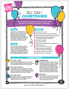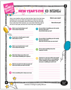 Start a new tradition with your kids this New Year’s Eve! Ask these questions and, as you listen and respond to what your kids say, you will have a conversation about the person they are this year. If you write down their answers, you can revisit what they said at the end of next year, and see how much they have changed! Download the Activity Sheet