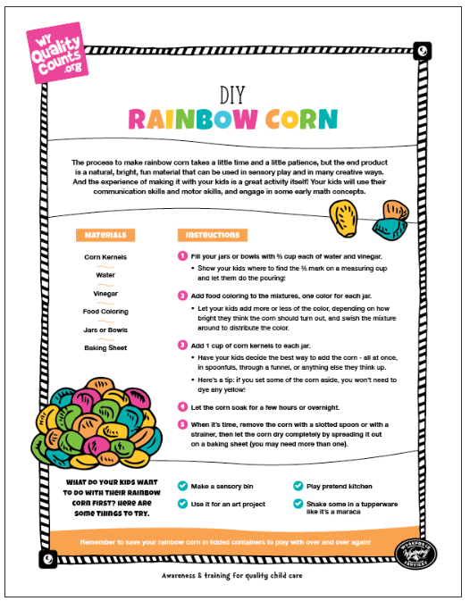 A new DIY material for your sensory bins and art projects: rainbow corn! A different take on rainbow rice, corn offers a new creative and sensory experience. Download the Activity Sheet