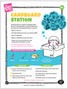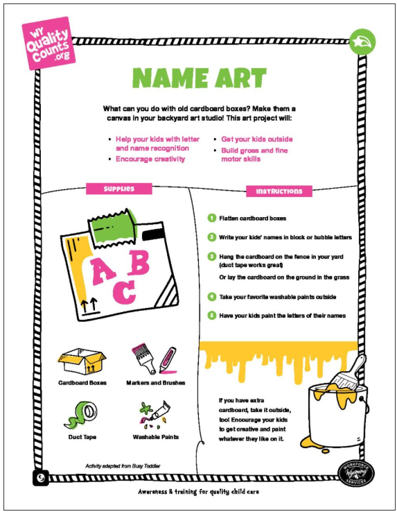 Flatten out your old cardboard boxes and take them outside. Outline your kids’ names on the cardboard and have them paint in the letters for an easy name-recognition and early literacy activity! Download the Activity Sheet