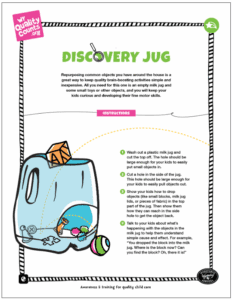 You probably have an empty milk jug and some toys in your house, so you’re already set up to create a Discovery Jug! With just a few simple materials, you will spark your kids’ curiosity and develop their fine motor skills. Download the Activity Sheet