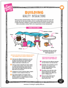 Children learn from watching and imitating the important people in their lives – that’s you! When you let your kids help with activities you are engaged in, you’re giving them the self-confidence to take on new things. For a fun activity they can help with every step of the way, go camping together – indoors! We created this checklist of supplies and tasks to help get you started. Download the Activity Sheet