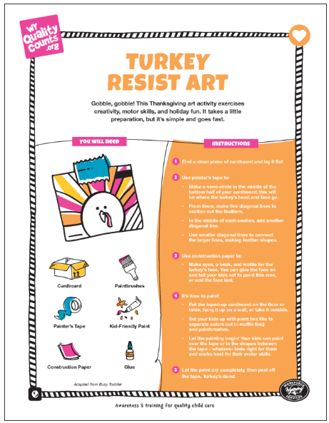 Gobble, gobble! This “resist art” activity is a fun Thanksgiving project to do with your kids. It will inspire their creativity and exercise their motor skills, too! Download the Activity Sheet