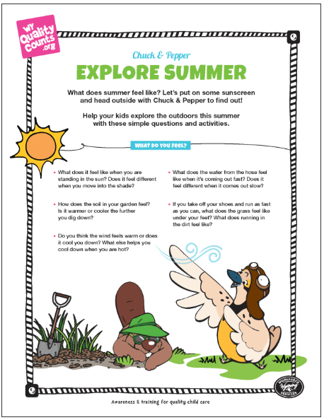 What does summer feel like? Put on some sunscreen, head outside and find out! Help your kids explore the outdoors this summer with these simple questions and activities. Download the Activity Sheet