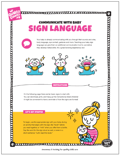 Your baby is already communicating with you through their sounds and cries, body language, eye contact, gestures and more. Teaching your baby sign language can give them an additional communication tool to use before they develop verbal skills. It’s a great bonding experience, too! There are ten basic signs to start with. You can download, print, and hang up this instructional sheet wherever it might be convenient to have a reminder of how the signs are formed! Download the Activity Sheet