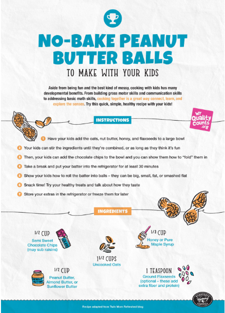 Try this quick, simple, healthy recipe with your kids! Aside from being fun and the best kind of messy, cooking with kids has many developmental benefits. From building gross motor skills and communication skills to addressing basic math skills, cooking together is a great way connect, learn, and explore the senses. Download the Activity Sheet