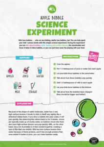 Kids love bubbles … who are we kidding, adults love bubbles, too! You can help spark your kids’ curious minds with this simple science experiment. With this experiment, you can talk about bubbles, water tension, and surface tension, you can explore coordination and focus, or you can just have some fun playing with your food. Download the Activity Sheet