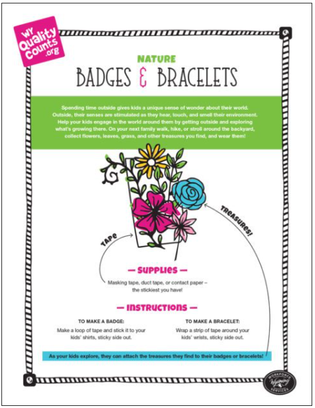 Spending time outside gives kids a unique sense of wonder about their world. Outside, their senses are stimulated as they hear, touch, and smell their environment. Help your kids engage in the world around them by getting outside and exploring what’s growing there. On your next family walk, hike, or stroll around the backyard, collect flowers, leaves, grass, and other treasures you find, and wear them! Download the Activity Sheet