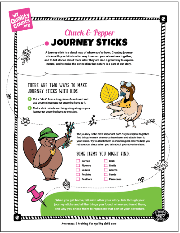 As you explore the world with your kids, keep a record of your adventures! Journey sticks are fun to make, they help your kids stay engaged as you explore, and they are a great tool for storytelling. Download the Activity Sheet